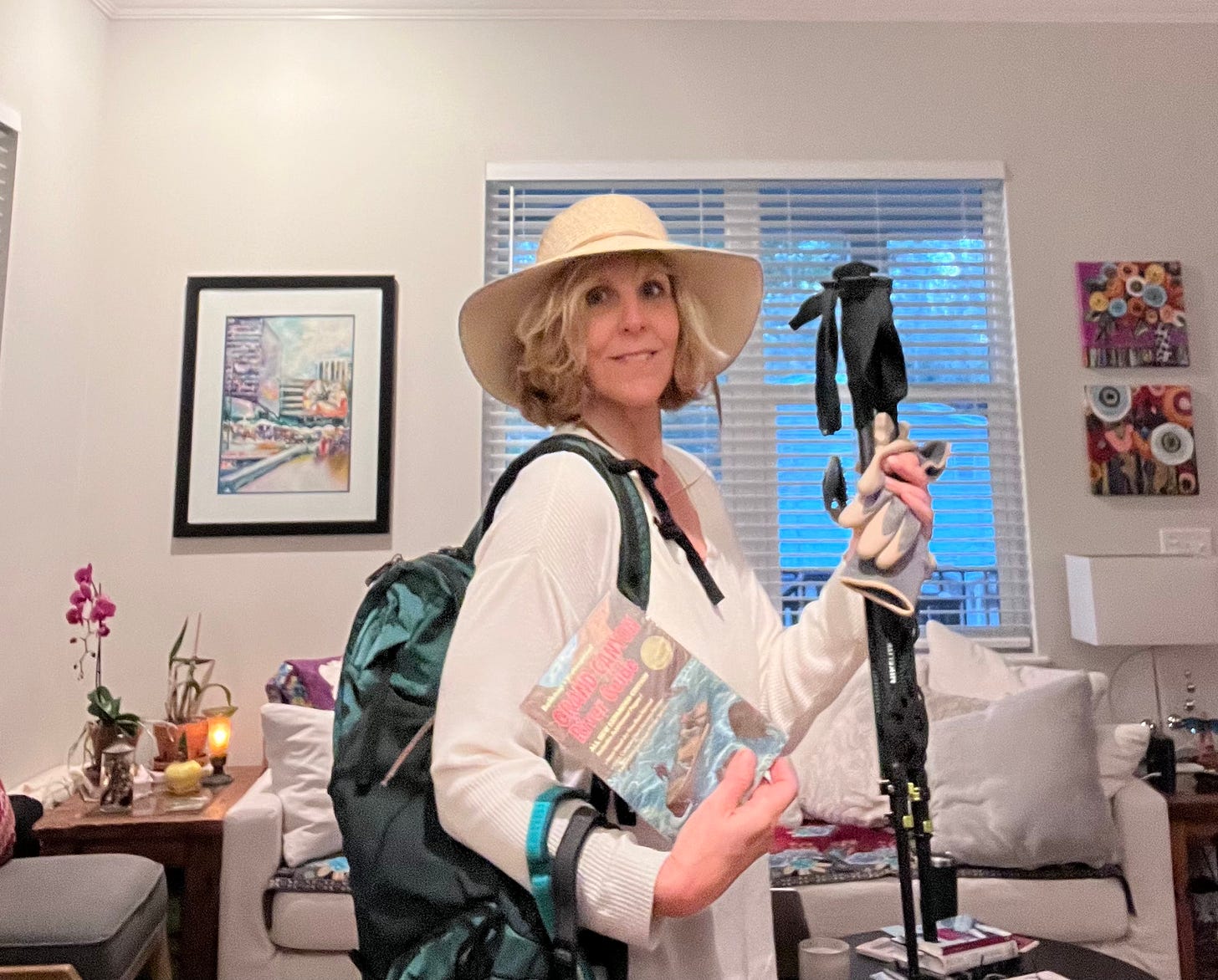 Here I am with some of my purchases: a “small” backpack, sunhat with aforementioned retention strap, hiking poles, gloves for hauling gear and doing something with ropes, a waterproof river guide/map, which I hope is for enjoyment and not actually mapping on my part, and two headlamps which you can’s see very well in this photo but that are hanging from my right arm. (They will be needed for my one or two minimum middle-of-the-night visits to the loo, which I’m trying not to think about.)